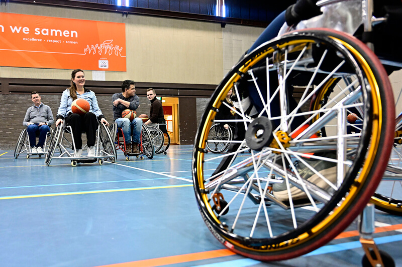 Na opnieuw een wandeling arriveerde de coalitie in de multihal, waar rolstoelen, baskets en ballen klaarstonden. Mariska Beijer deelde haar indrukwekkende levensverhaal. “Mijn jeugd stond in het teken van ziek zijn, operaties en een laag zelfvertrouwen,” vertelde zij. Ze beschreef hoe sport haar leven veranderde. “Via sport vond ik kracht, structuur en geloof in mezelf.” Over Papendal zei zij: “Hier leerde ik vaardigheden die ik vroeger miste, zoals samenwerken, doorzetten en vertrouwen.” Na haar verhaal namen de deelnemers zelf plaats in de rolstoelen voor een fanatiek potje rolstoelbasketbal.